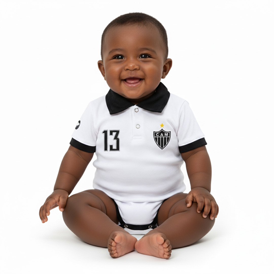Body manga curta oficial do Atlético MG, com gola polo, ideal para vestir o seu bebê dos pés a cabeça com as cores do Galo e expressar todo amor pelo Atlético MG, desde os primeiros dias de vida.