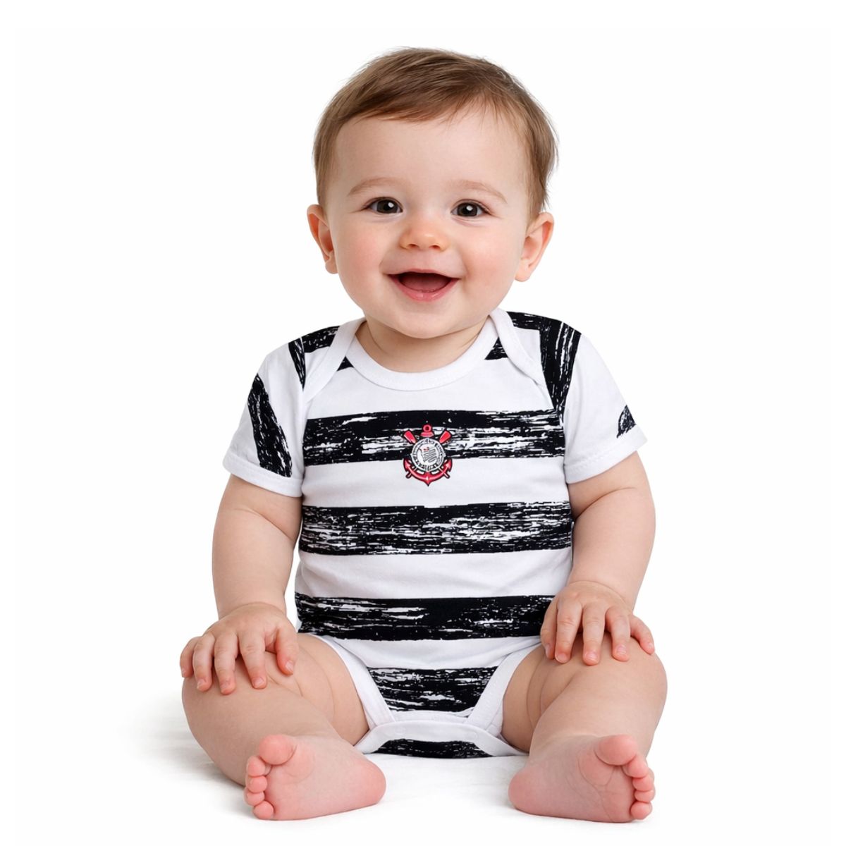 O Body Corinthians listrado foi desenvolvido para os pequenos que são torcedores desde o berço. Com o body manga curta a nova geração de campeões fica devidamente fardada com as cores do seu time de coração. Garanta o futuro das arquibancadas e vista os mini torcedores com o primeiro dos muitos mantos que ainda virão.