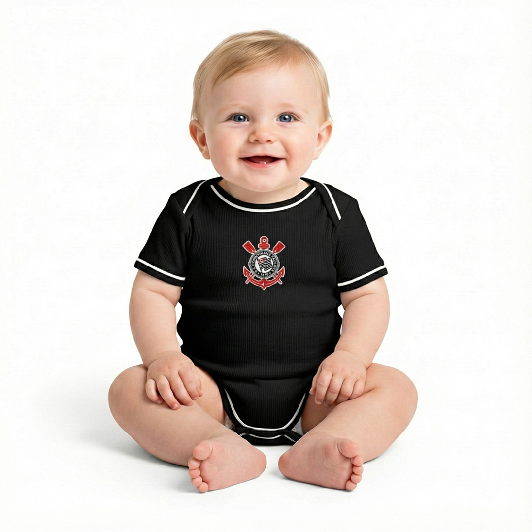 Body manga curta oficial do Corinthians Preto, ideal para vestir o seu bebê dos pés a cabeça com as cores do Timão.