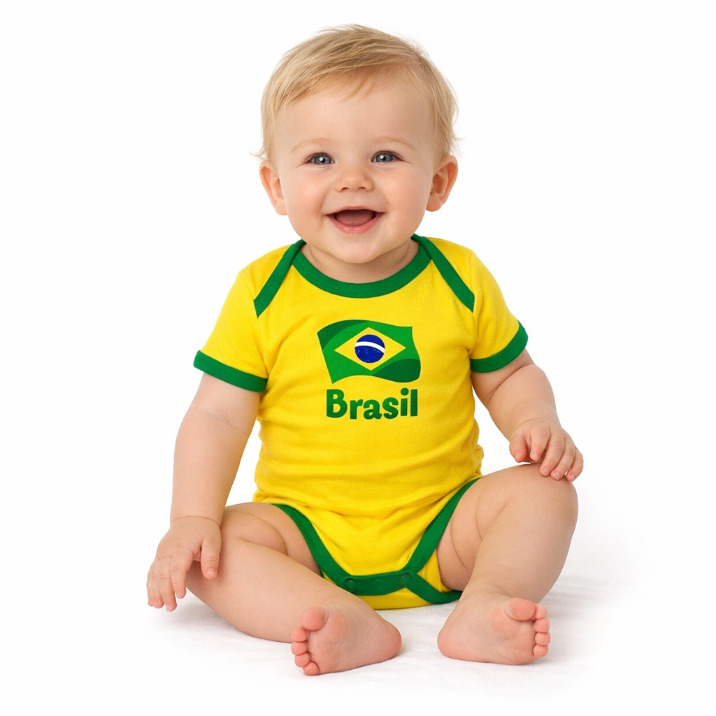 Body manga curta oficial do Brasil, com gola polo, ideal para vestir o seu bebê dos pés a cabeça com as cores do Brasil e expressar todo amor pela Patria desde os primeiros dias de vida.