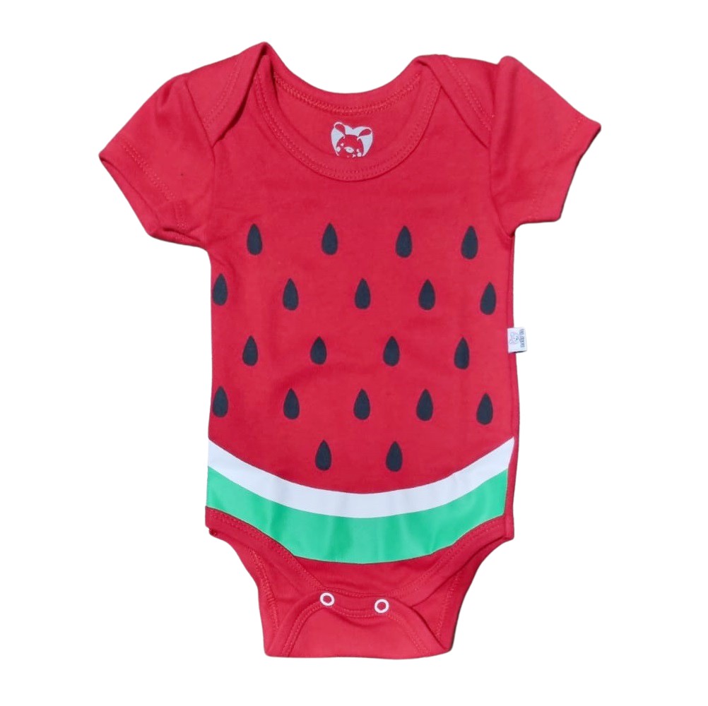 Lindo Body Bebê estampa de melância, com gola redonda, fechamento por botões de pressão. Manga Curta com barra pespontada. Fechamento entre pernas por botões de pressão. Barra com acabamento em viés.