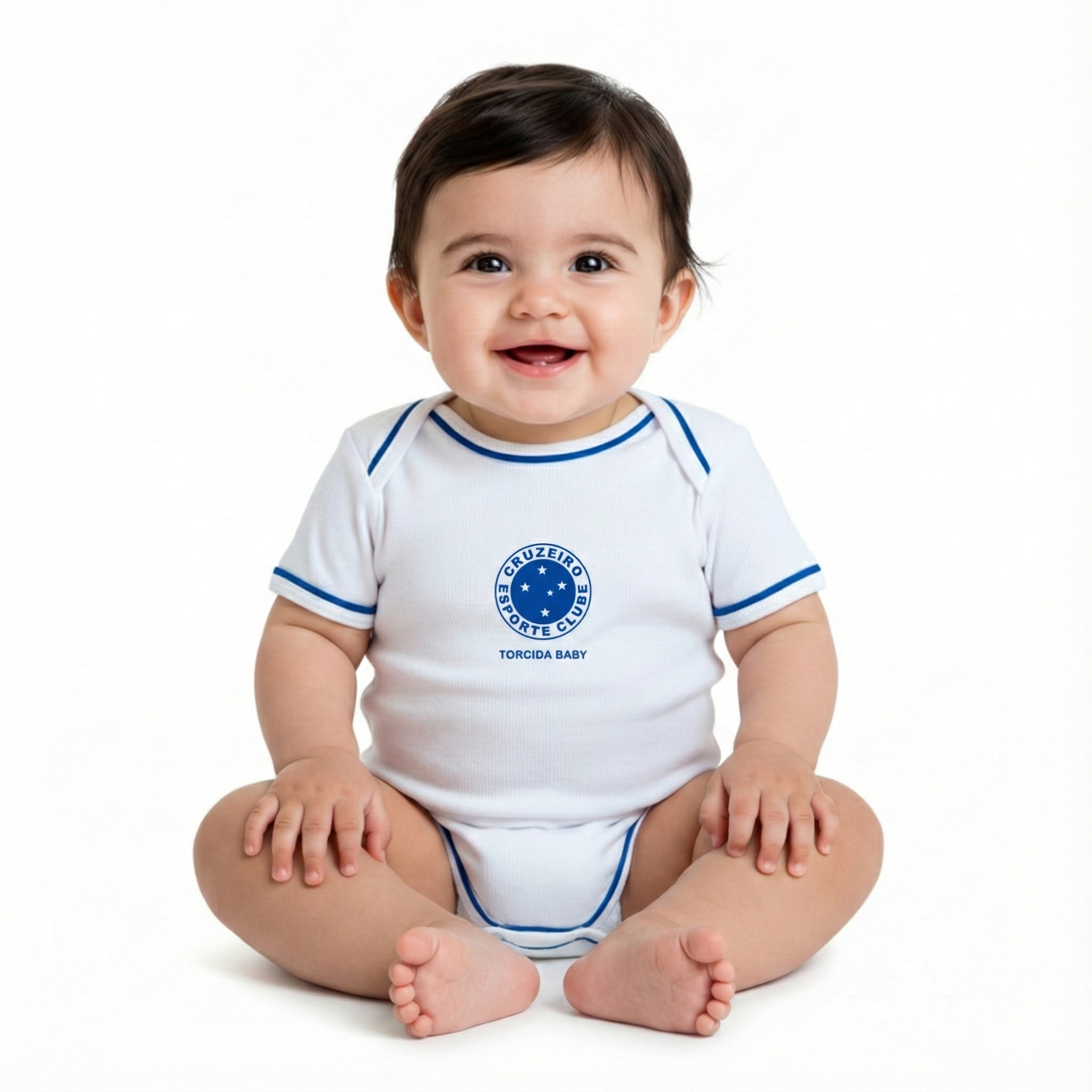Body manga curta oficial do Cruzeiro branco, ideal para vestir o seu bebê dos pés a cabeça com as cores do Cruzeiro.