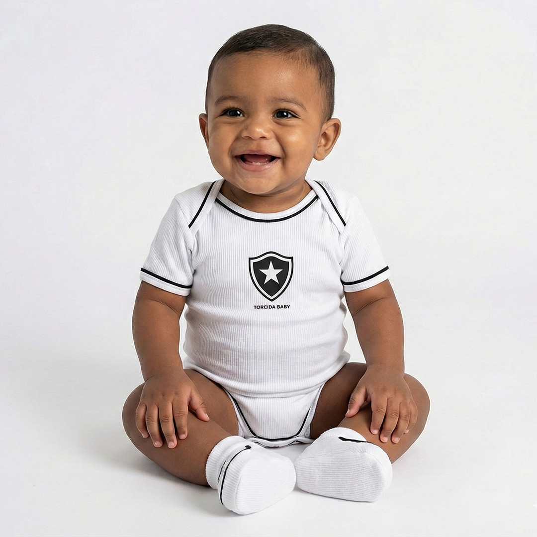 Composto por um body manga curta e uma pantufa, esse lindo kit do Botafogo irá vestir o seu bebê dos pés a cabeça, com as cores do Fogão.