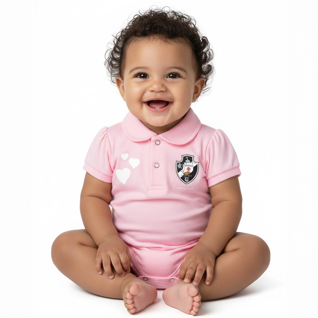 Body manga curta oficial do Vasco, com muito charme na cor rosa, ideal para vestir as pequenas torcedoras do Vasco com muito charme e elegância e expressar todo amor pelo time desde os primeiros dias de vida.