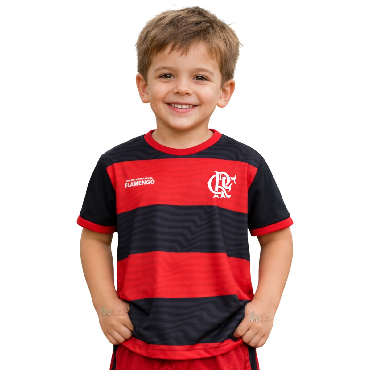 A camisa do Flamengo apresenta um design clássico e marcante, com listras horizontais nas cores preta e vermelha, que remetem à tradição do time. No lado esquerdo do peito, está o escudo do clube com as letras “CRF” em branco, enquanto no lado direito aparece a inscrição “CLUBE DE REGATAS DO FLAMENGO”, também em branco, reforçando o orgulho rubro-negro. As mangas são predominantemente pretas, com uma faixa vermelha na extremidade, e a gola redonda vermelha complementa o visual com elegância e personalidade. É uma peça que carrega história, paixão e identidade.