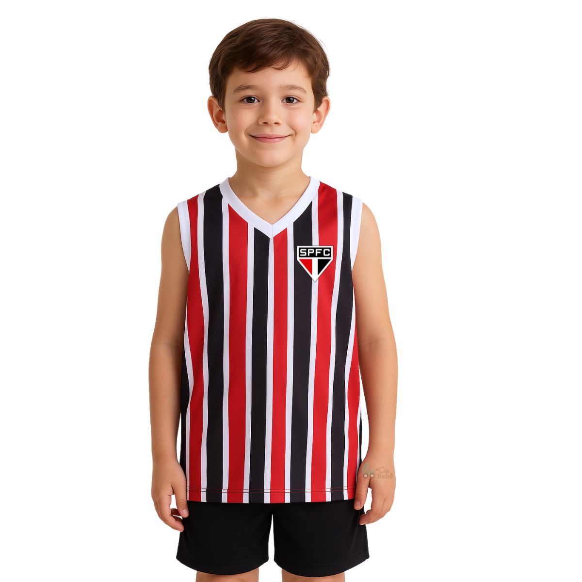 A camiseta São Paulo Infantil Regata listrada oficial é uma peça de roupa para crianças feita de malha dry 100% poliéster. É confortável, absorve o suor e é durável. É ideal para atividades físicas ou para mostrar apoio ao SPFC.
