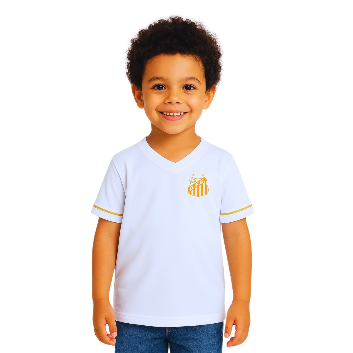 A Camiseta Santos Infantil premium Oficial é uma peça de vestuário licenciada pelo Santos. Apresenta um design elegante na cor branca com o escudo em estampa dourada. Feita com tecido confortável e disponível em tamanhos infantis, é ideal para crianças que desejam mostrar seu apoio ao Santos.