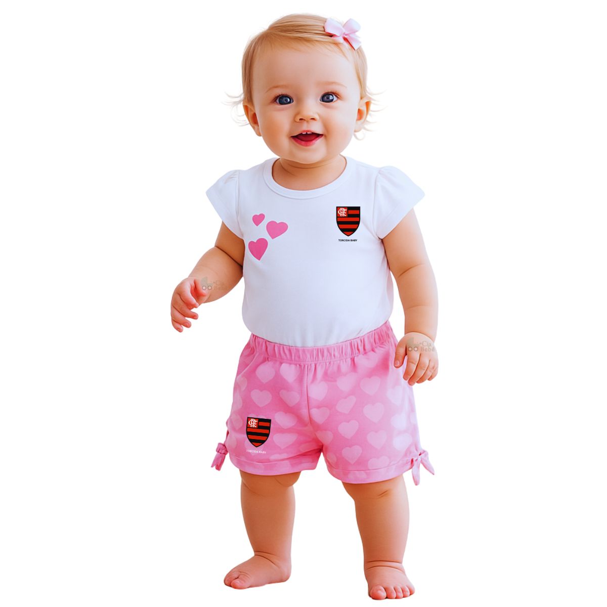 Conjunto do Flamengo Oficial, licenciado. Composto por uma camiseta branca, com estampas de corações rosas e o escudo do Mengão e um shorts rosa com o escudo do Flamengo na parte frontal. Com esse lindo conjunto do Flamengo você poderá vestir o seu bebê dos pés a cabeça, com as cores do Mengão, com muito charme e elegância.