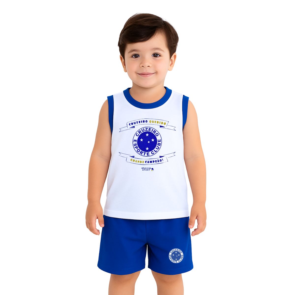Conjunto Infantil Machão Cruzeiro, é a combinação que faltava para os pequenos realizarem o sonho de vestir, da cabeça aos pés, a paixão pelo seu time. Conjunto infantil com camiseta regata em material algodão e bermuda em poliester. Produto oficial e licenciado.