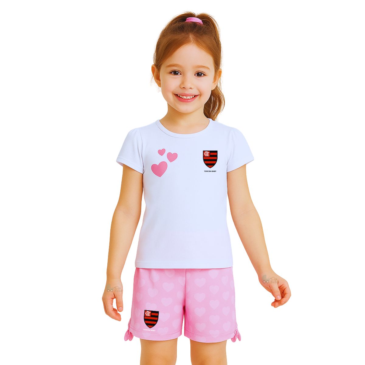 Conjunto do Flamengo Oficial, licenciado. Composto por uma camiseta branca, com estampas de corações rosas e o escudo do Mengão e um shorts rosa com o escudo do Flamengo na parte frontal. Com esse lindo conjunto do Flamengo você poderá vestir o seu bebê dos pés a cabeça, com as cores do Mengão, com muito charme e elegância.