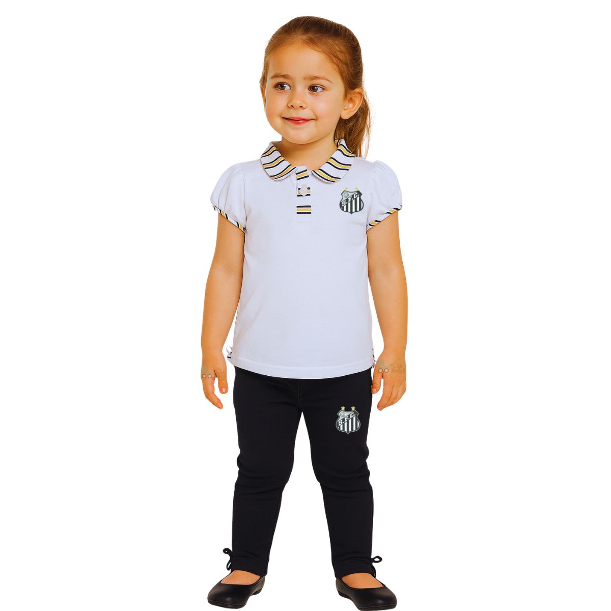 Este conjunto infantil é perfeito para as pequenas torcedoras do Santos! O conjunto inclui uma camiseta polo branca com detalhes em preto e amarolo na gola, combinando elegância e estilo com o escudo do time. A calça preta possui detalhes na barra, proporcionando um visual moderno e confortável para usar em qualquer ocasião, seja torcendo nos jogos ou em momentos casuais. Um jeito charmoso e cheio de amor para expressar a paixão pelo Peixãodesde cedo!