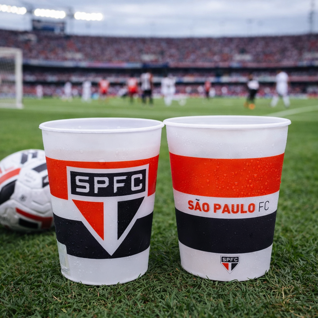Esse Jogo com 2 copos de plástico de 400 ml é revestido com imagem em 3D. Vem gravado com escudo do São Paulo.Esse Jogo de Copos é ideal para expressar toda paixão pelo Seu time.