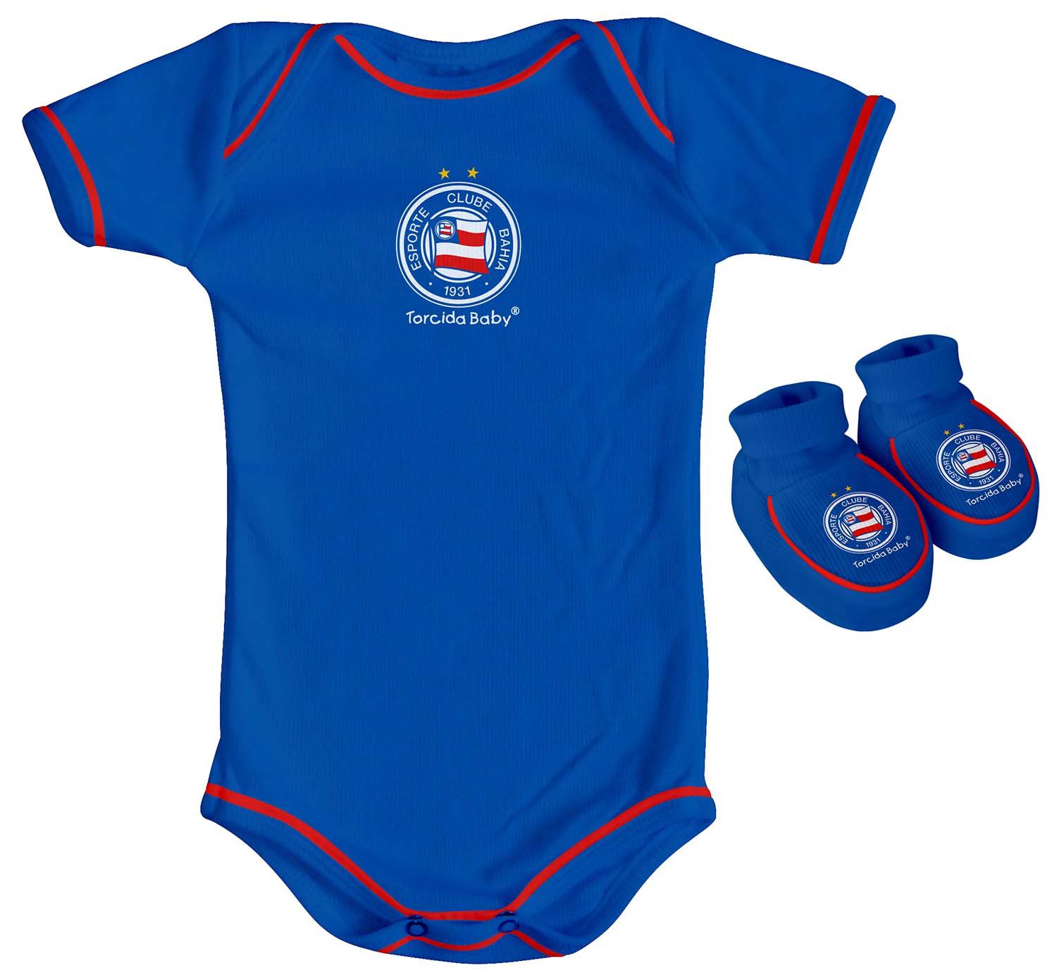 Composto por um body manga curta e uma pantufa, esse lindo kit do Bahia irá vestir o seu bebê dos pés a cabeça, com as cores do Bahia.