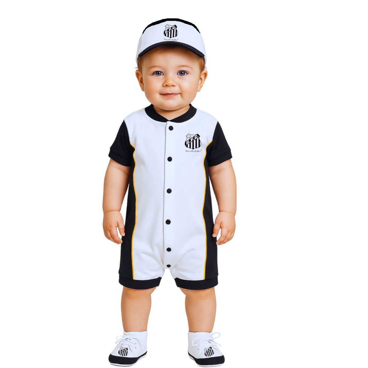 O Kit Torcida Baby oficial é composto por um macacão, um boné e um sapatinho. Esse lindo kit do Santos FC é ideal para vestir o seu bebê dos pés a cabeça, com as cores do Santos. Não fique de fora dessa torcida.