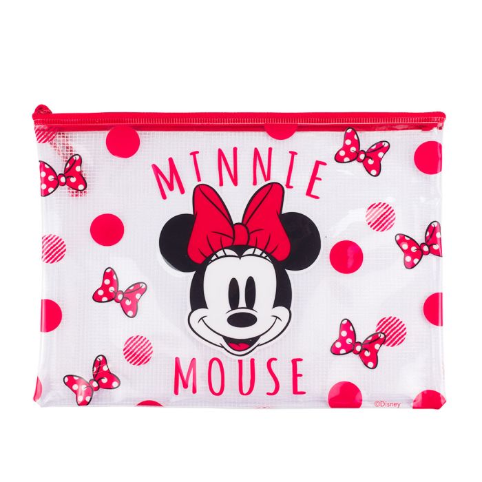 Necessaire estojo com 23 x 32 cm de dimensão, transparente e estampado com imagem da Minnie.