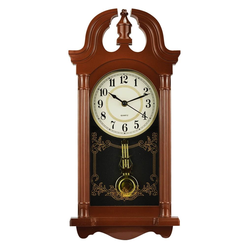 Relógio de parede na cor marrom estilo clássico com 51 cm de altura e 23 cm de largura. Ponteiros para horas, minutos e segundos. Numeração arábica. Material: plástico; Funcionamento: 1 pilha AA