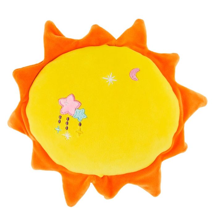 Bichinho de pelúcia no formato de um um sol amarelo e bordas em laranja de 26 x 26 cm de dimensão.